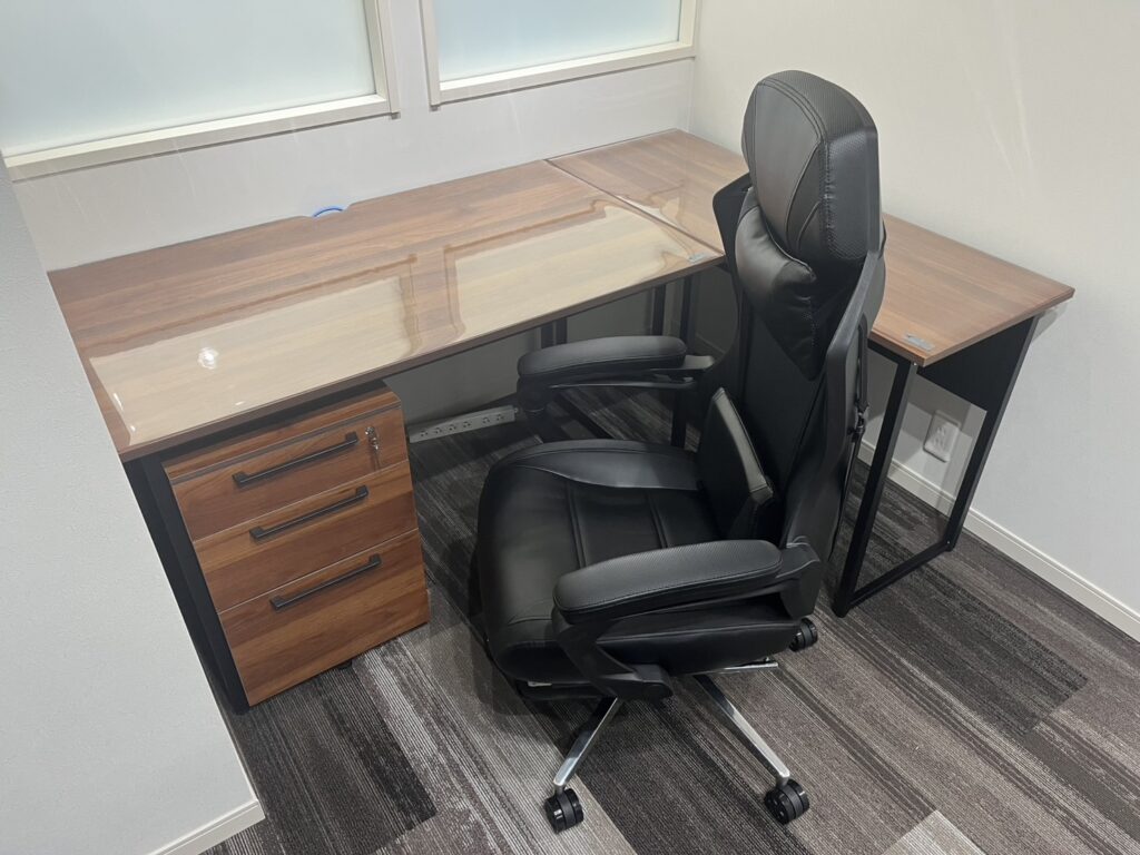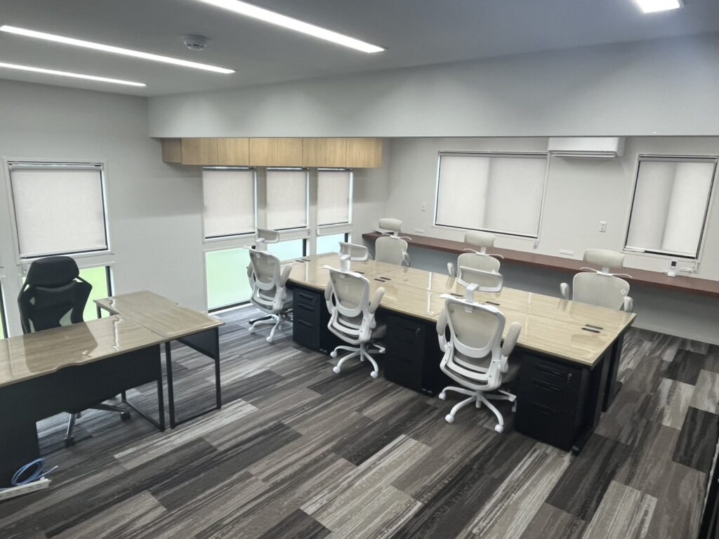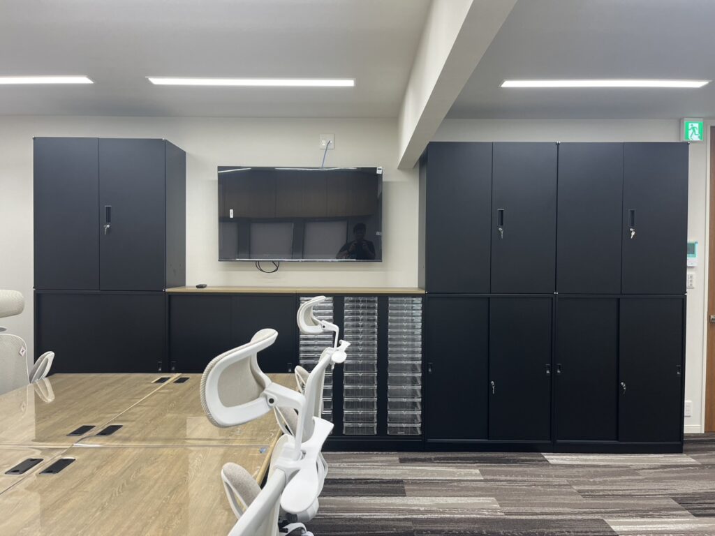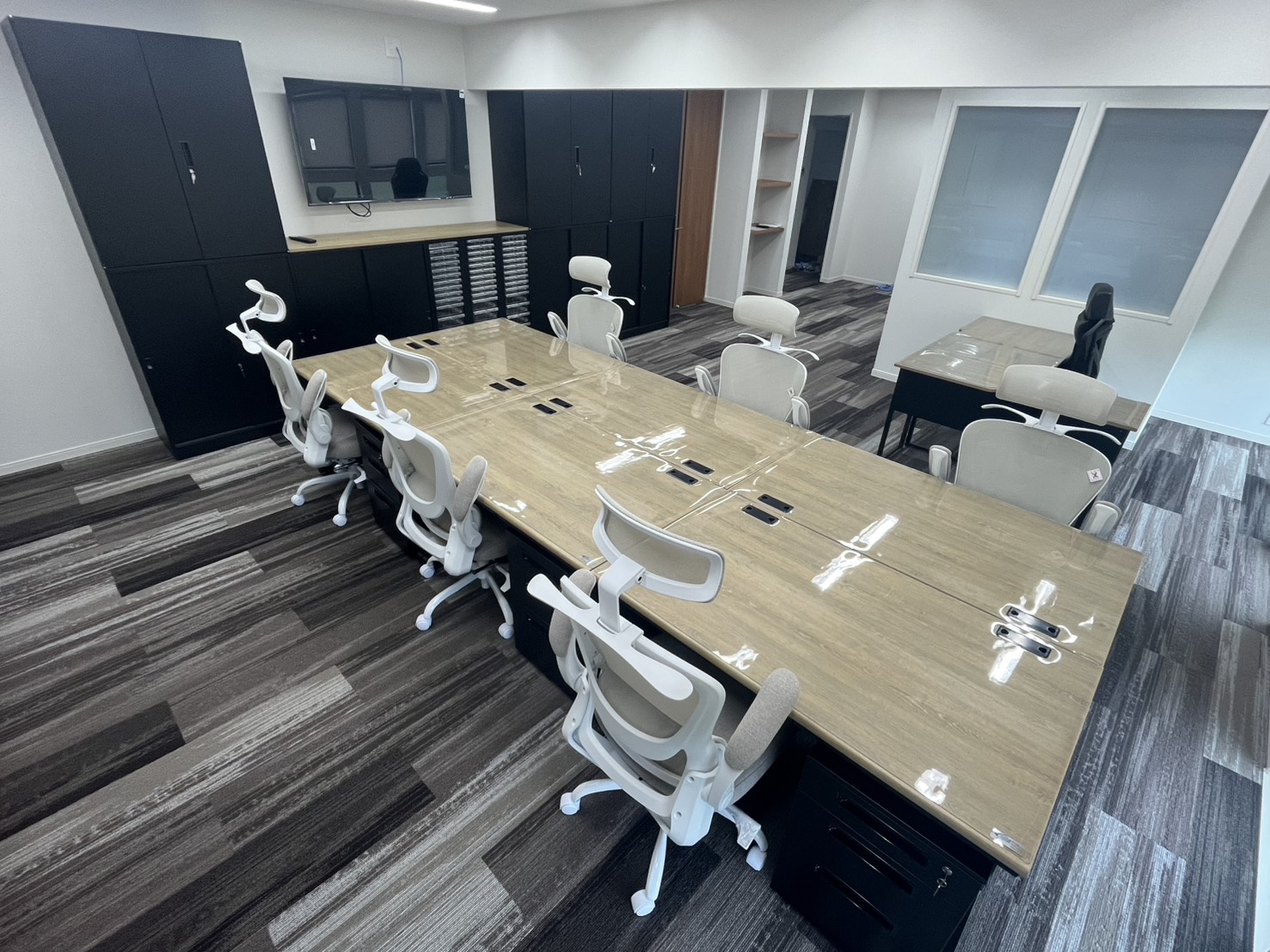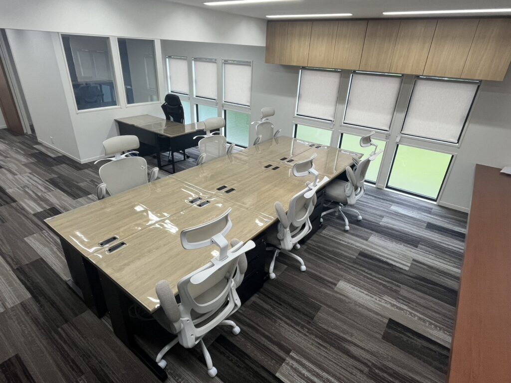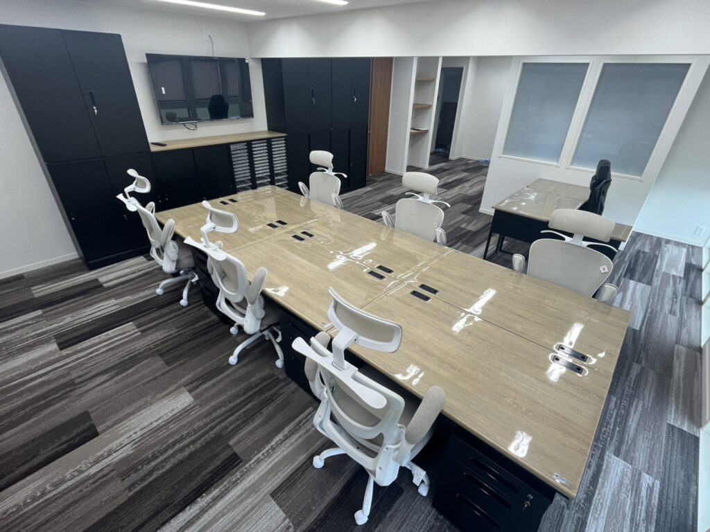 従業員様のコミュニケーションがとれ、全体会議では大画面で情報を共有したいとのご要望により、何度も打合せを行い、レイアウト作成させて頂きました。また、社長様のご希望により、家具は明るい木目とブラックを選ばせて頂きました。