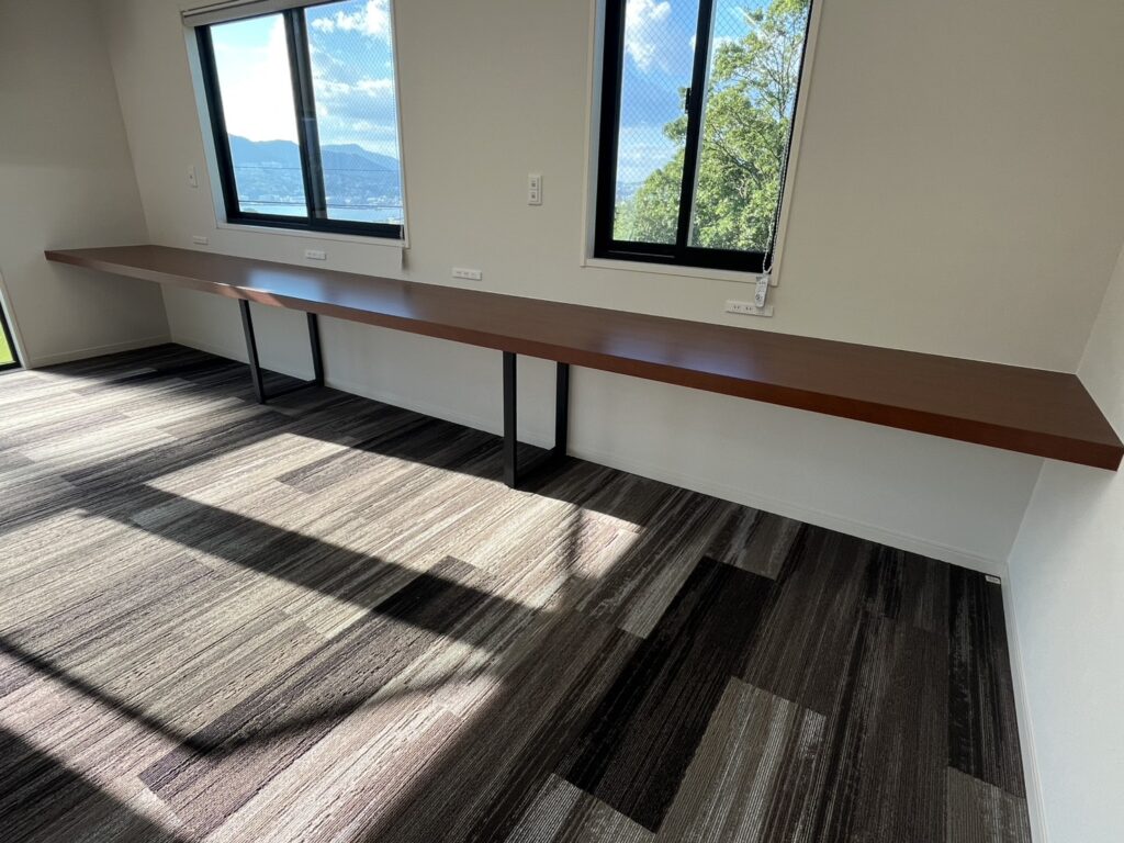 | 施工内容 | OAフロア・タイルカーペット工事 窓際カウンター 吊戸棚 |